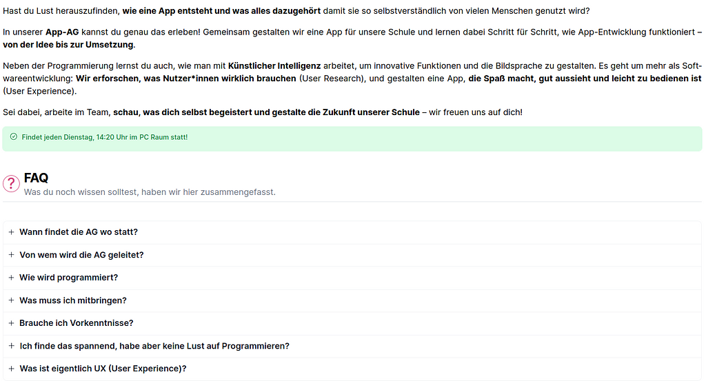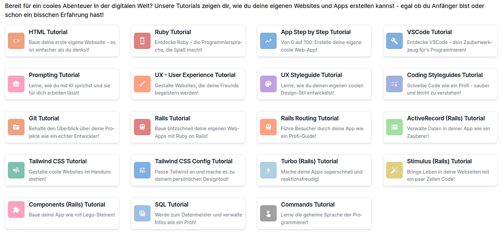 Automatisierte Online-Entwicklungsumgebungen mit Coder: Individuelle Entwicklungsumgebungen überall und selbst mit dem iPad zu erreichen, keine verlorenen Stunden durch komplizierte Setups. Mit KI entwickelte Tutorials: Als Leitpfaden für den didaktischen Ansatz und damit jede:r individuell lernen kann, auch unabhängig vom AG-Termin. (Was ich immer noch hoffe :-D)